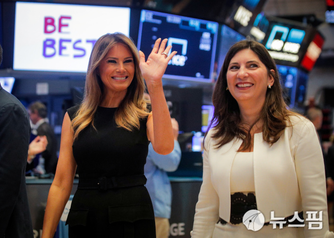 | [뉴욕 로이터=뉴스핌] 김근철 기자=도널드 트럼프 미국 대통령 부인 멜라니아 여사(왼쪽)가 23일(현지시간) 뉴욕증권거래소(NYSE)를 방문, 스테이스 커닝햄 최고경영자(CEO)와 함께 걸어가고 있다. 2019.09.23. |