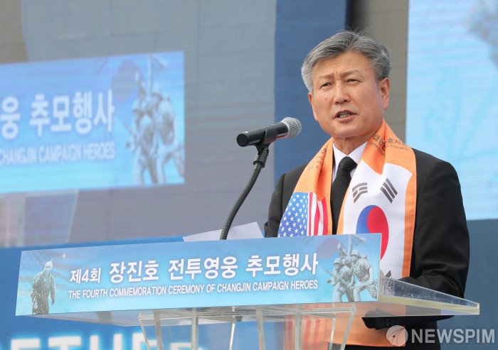 [서울=뉴스핌] 백인혁 기자 = 박삼득 국가보훈처장이 27일 오후 서울 용산구 전쟁기념관 평화의광장에서 열린 '제4회 장진호 전투영웅 추모식'에서 문재인 대통령의 추념사를 대독하고 있다. 2019.09.27 dlsgur9757@newspim.com