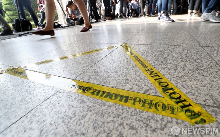[서울=뉴스핌] 정일구 기자 = 조국 법무부 장관 부인 정경심 동양대학교 교수의 검찰 소환이 임박한 1일 오전 서울 서초구 서울중앙지방검찰청 출입문 앞에 포토라인이 붙어있다. 2019.10.01 mironj19@newspim.com