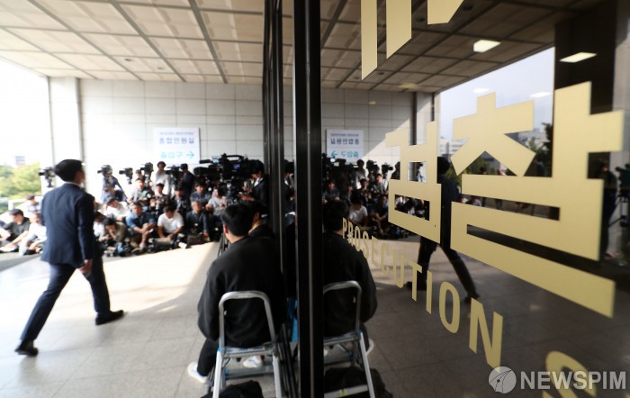 [서울=뉴스핌] 정일구 기자 = 조국 법무부 장관 부인 정경심 동양대학교 교수의 검찰 소환이 임박한 1일 오전 서울 서초구 서울중앙지방검찰청 출입문 앞에서 취재진들이 대기하고 있다. 2019.10.01 mironj19@newspim.com