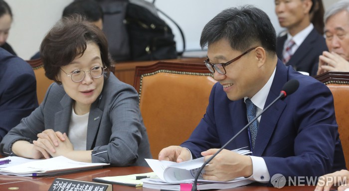[서울=뉴스핌] 최상수 기자 = 박혜자 한국교육학술정보원 원장, 윤여각 국가평생교육진흥원 원장이 4일 오후 서울 여의도 국회 교육위원회에서 열린 교육부 소관 공공기관 및 유관기관 등에 대한 국정감사에서 대화를 나누고 있다. 2019.10.04 kilroy023@newspim.com