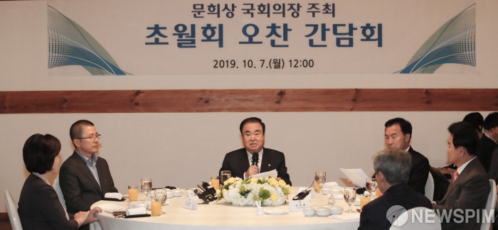 [서울=뉴스핌] 백인혁 기자 = 문희상 국회의장(가운데)이 7일 오후 서울 여의도 국회 사랑재에서 열린 초월회 오찬 간담회에 참석해 발언하고 있다. 2019.10.07 dlsgur9757@newspim.com