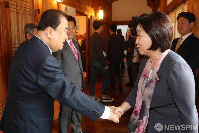 [서울=뉴스핌] 백인혁 기자 = 문희상 국회의장(왼쪽)과 심상정 정의당 대표가 7일 오후 서울 여의도 국회 사랑재에서 열린 초월회 오찬 간담회에 참석해 악수를 나누고 있다. 2019.10.07 dlsgur9757@newspim.com