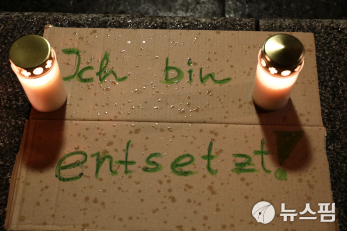 | [베를린 로이터=뉴스핌] 전솔희 인턴기자 = 9일(현지시간) 독일 베를린의 유대교회당에서 열린 동부 할레 총격사건 희생자 추모식에 ‘공포스럽다!’라고 쓰인 플래카드가 놓여있다. 이날 할레에서는 총격사건으로 2명이 숨졌다. 2019.10.09. |