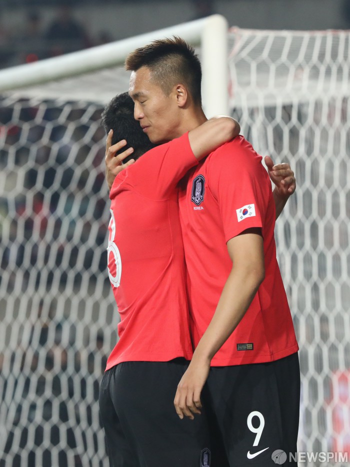 [화성=뉴스핌] 백인혁 기자 = 10일 오후 경기도 화성시 화성종합경기장에서 열린 2022 국제축구연맹(FIFA) 카타르 월드컵 H조 2차전 대한민국과 스리랑카의 경기에서 김신욱 선수(오른쪽)가 득점에 성공한 뒤 남태희 선수와 포옹하고 있다. 2019.10.10 dlsgur9757@newspim.com