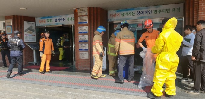 | 11일 오전 10시 8분께 경기 수원시 한 고등학교에서 유리병에 있던 독성물질인 포르말린이 누출돼 소방과 경찰 당국이 조치를 취하고 있다. [사진=경기도소방재난안전본부] |