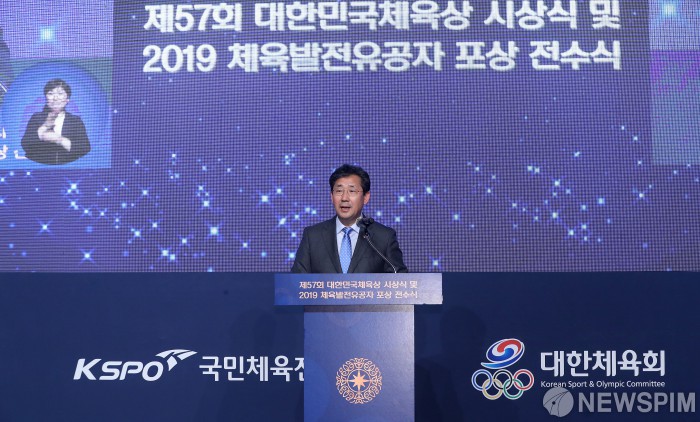 [서울=뉴스핌] 정일구 기자 = 박양우 문화체육관광부 장관이 15일 오후 서울 중구 더 플라자호텔에서 열린 '제57회 대한민국체육상 시상식 및 2019 체육발전유공자 포상 전수식'에서 축사를 하고 있다. 2019.10.15 mironj19@newspim.com