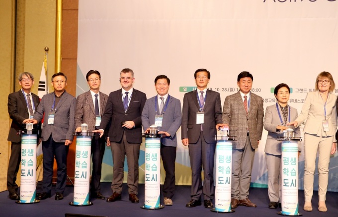 | 박승원 광명시장(좌측에서 다섯번째)이 28일 서울 서대문구 그랜드 힐튼호텔서울 본관에서 열린 2019 국제 평생학습도시 포럼에 참석했다. [사진=광명시] |