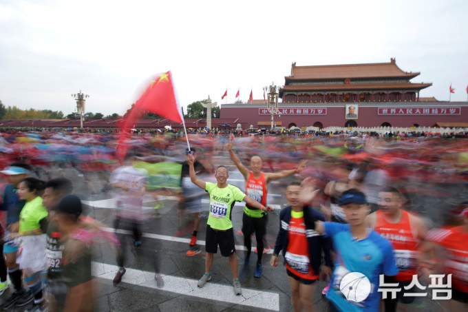 | [베이징 로이터=뉴스핌] 최원진 기자= 중국 베이징 마라톤에 참가한 한 남성이 톈안먼 광장 앞을 지나면서 국기를 흔들고 있다. 2019.11.03 |