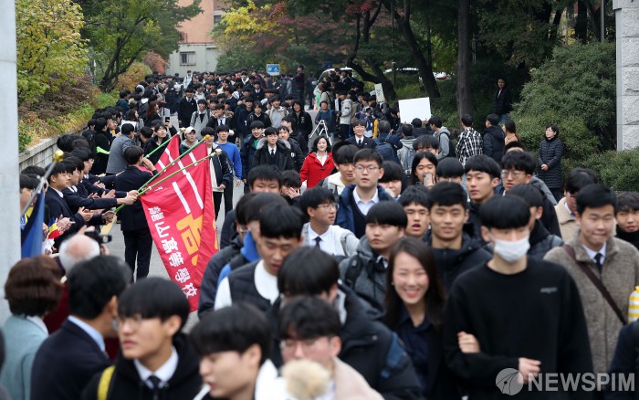 [서울=뉴스핌] 정일구 기자 = 2020학년도 대학수학능력시험을 하루 앞둔 13일 오전 서울 용산구 용산고등학교에서 열린 수능 출정식에서 고3 수험생들이 교직원과 후배들의 응원을 받으며 하교하고 있다. 2019.11.13 mironj19@newspim.com