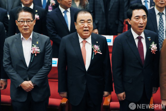 [서울=뉴스핌] 이형석 기자 = 문희상 국회의장이 13일 오전 서울 여의도 국회 의원회관에서 열린 유엔 해비타트 한국위원회 출범식에서 애국가를 부르고 있다. 2019.11.13 leehs@newspim.com