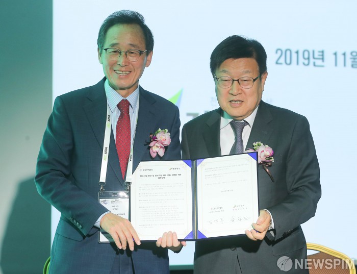 [서울=뉴스핌] 윤창빈 기자 = 김영주 한국무역협회 회장(오른쪽부터), 송하진 전라북도 도지사가 13일 오전 서울 강남구 코엑스에서 열린 2019 국제복합소재 전시회(JEC ASIA 2019) 탄소산업 발전 및 탄소기업 해외진출 확대를 위한 업무협약 체결식에서 기념촬영을 하고 있다. JEC ASIA에서는 ICF(국제 탄소 페스티발)를 비롯한 폭넓은 콘퍼런스 프로그램과 복합소재투어, JEC 혁신상 등 다양한 프로그램이 제공된다. 2019.11.13 pangbin@newspim.com