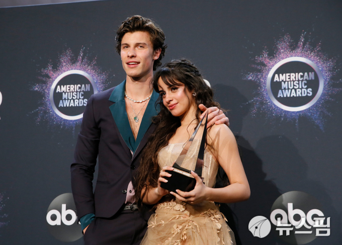 [로스앤젤레스 로이터=뉴스핌] 최원진 기자= 가수 션 멘데스(좌)와 카밀라 카베요가 '2019 아메리칸 뮤직 어워드'에 참석했다. 두 사람은 '올해의 콜라보레이션 작품상'을 수상했다. 2019.11.24 wonjc6@newspim.com