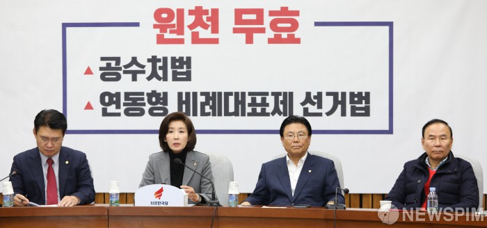 [서울=뉴스핌] 최상수 기자 = 나경원 자유한국당 원내대표가 29일 오전 서울 여의도 국회에서 열린 원내대책회의에서 모두발언을 하고 있다. 2019.11.29 kilroy023@newspim.com
