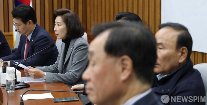 [서울=뉴스핌] 최상수 기자 = 나경원 자유한국당 원내대표가 29일 오전 서울 여의도 국회에서 열린 원내대책회의에서 모두발언을 하고 있다. 2019.11.29 kilroy023@newspim.com