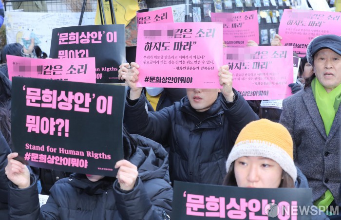 [서울=뉴스핌] 백인혁 기자 = 4일 오후 서울 종로구 옛 일본대사관 앞 평화로에서 열린 일본군 성노예제 문제해결을 위한 제1416차 정기 수요시위에서 참가자들이 문희상 국회 의장이 일본과의 외교문제 해결을 위해 제시한 문희상안에 반대하는 피켓을 들고 있다. 2019.12.04 dlsgur9757@newspim.com