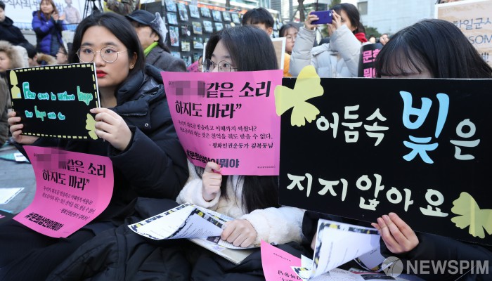 [서울=뉴스핌] 백인혁 기자 = 4일 오후 서울 종로구 옛 일본대사관 앞 평화로에서 열린 일본군 성노예제 문제해결을 위한 제1416차 정기 수요시위에서 참가자들이 문희상 국회 의장이 일본과의 외교문제 해결을 위해 제시한 문희상안에 반대하는 피켓을 들고 있다. 2019.12.04 dlsgur9757@newspim.com