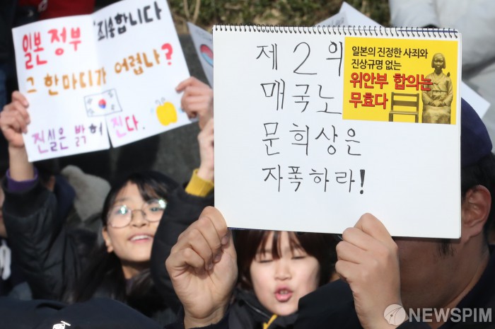 [서울=뉴스핌] 백인혁 기자 = 4일 오후 서울 종로구 옛 일본대사관 앞 평화로에서 열린 일본군 성노예제 문제해결을 위한 제1416차 정기 수요시위에서 참가자들이 문희상 국회 의장이 일본과의 외교문제 해결을 위해 제시한 문희상안에 반대하는 피켓을 들고 있다. 2019.12.04 dlsgur9757@newspim.com
