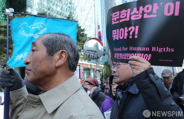 [서울=뉴스핌] 백인혁 기자 = 4일 오후 서울 종로구 옛 일본대사관 앞 평화로에서 열린 일본군 성노예제 문제해결을 위한 제1416차 정기 수요시위에서 일본인 참가자들이 문희상 국회 의장이 일본과의 외교문제 해결을 위해 제시한 문희상안에 반대하는 피켓을 들고 있다. 2019.12.04 dlsgur9757@newspim.com