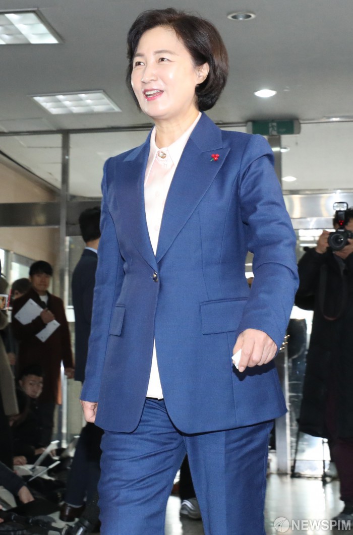 [사진] 미소 지으며 엘리베이터 향하는 추미애 법무부 장관 후보자
