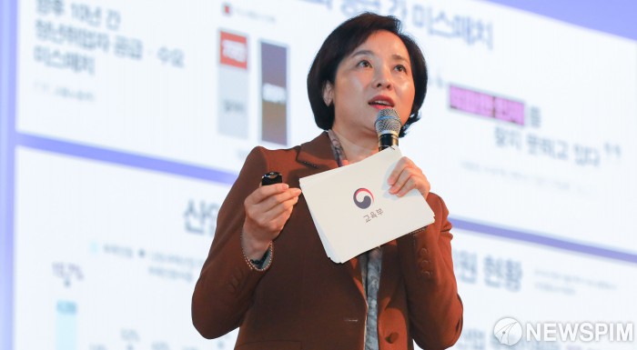 [서울=뉴스핌] 최상수 기자 = 유은혜 사회부총리 겸 교육부 장관이 10일 오전 서울 중구 대한상공회의소 국제회의장에서 열린 초청 CEO간담회에서 '지역·산업 맞춤형 미래 혁신인재 양성 추진방향' 등을 주제로 발표하고 있다. 2019.12.10 kilroy023@newspim.com