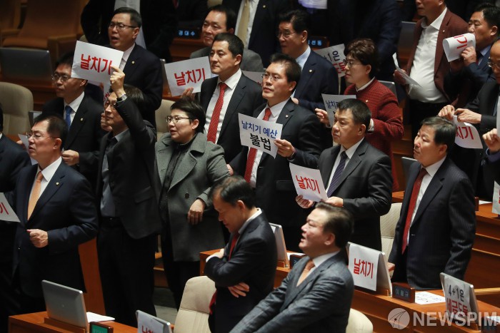 [서울=뉴스핌] 이형석 기자 = 10일 오후 서울 여의도 국회에서 열린 제371회 제12차 본회의에서 2020년도 예산안에 대한 수정안이 상정되자 자유한국당 의원들이 ‘날치기’ 문구가 적힌 피켓을 들고 항의를 하고 있다. 2019.12.10 leehs@newspim.com
