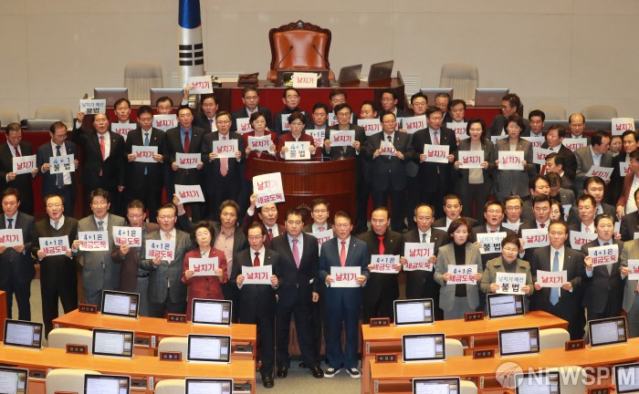 [서울=뉴스핌] 이형석 기자 = 10일 오후 서울 여의도 국회에서 열린 제371회 제12차 본회의에서 2020년도 예산안에 대한 수정안이 가결 됐다. 이날 자유한국당 의원들이 피켓을 들고 본회의장에서 항의를 하고 있다. 2019.12.10 leehs@newspim.com