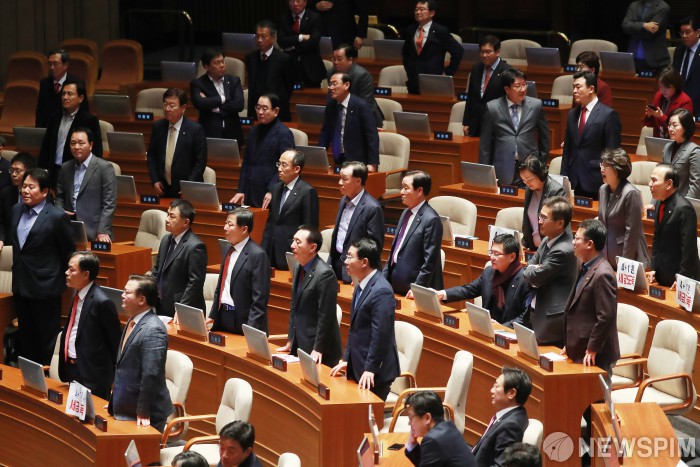 [서울=뉴스핌] 이형석 기자 = 10일 오후 서울 여의도 국회에서 열린 제371회 제12차 본회의에서 2020년도 예산안에 대한 수정안이 상정되자 자유한국당 의원들이 항의를 하고 있다. 2019.12.10 leehs@newspim.com