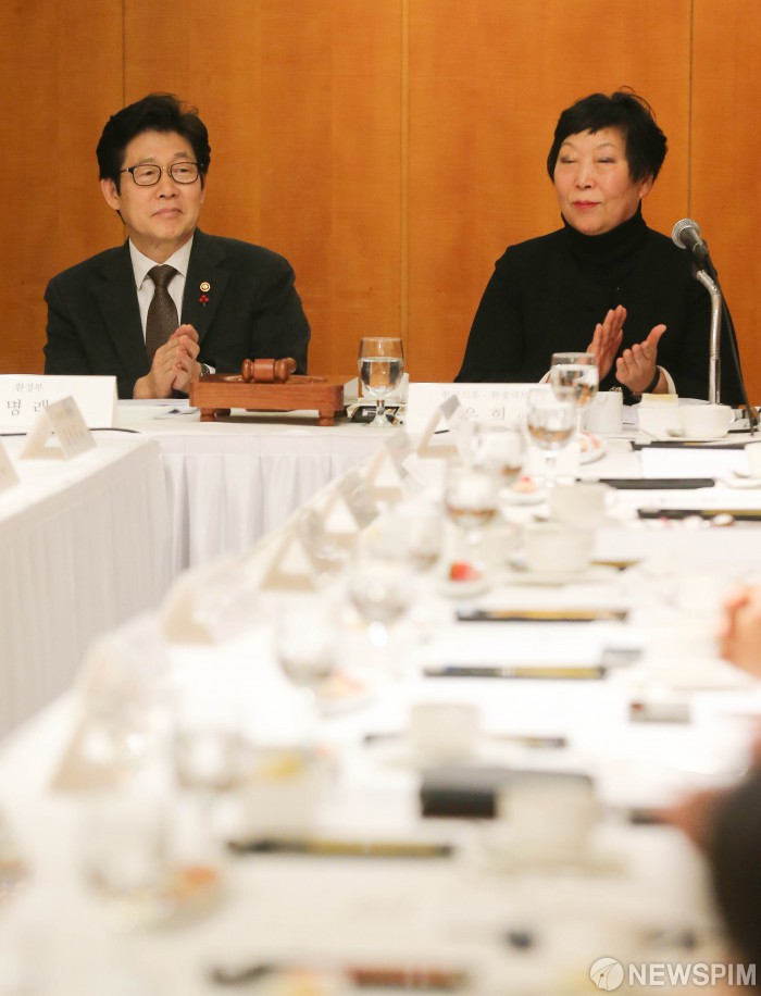 [서울=뉴스핌] 윤창빈 기자 = 조명래 환경부 장관, 이은희 한국기후⋅환경네트워크 상임대표가 20일 오후 서울 중구 롯데호텔에서 열린 제2차 한국기후⋅환경네트워크 대표자회의에서 박수를 치고 있다. 2019.12.20 pangbin@newspim.com