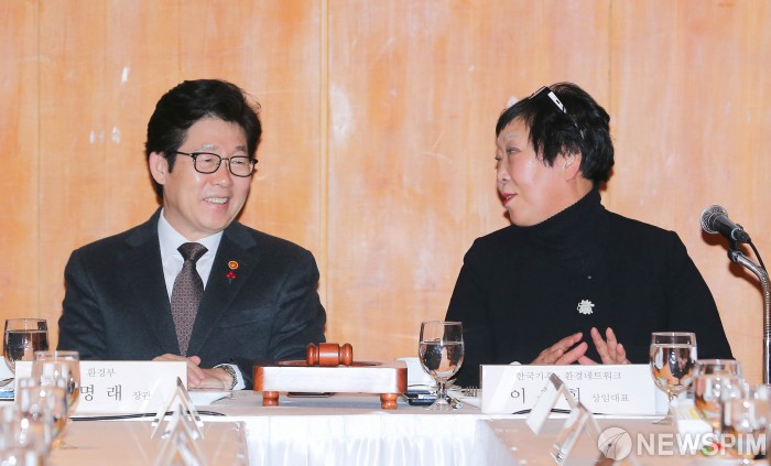[서울=뉴스핌] 윤창빈 기자 = 조명래 환경부 장관, 이은희 한국기후⋅환경네트워크 상임대표가 20일 오후 서울 중구 롯데호텔에서 열린 제2차 한국기후⋅환경네트워크 대표자회의에서 대화를 나누고 있다. 2019.12.20 pangbin@newspim.com