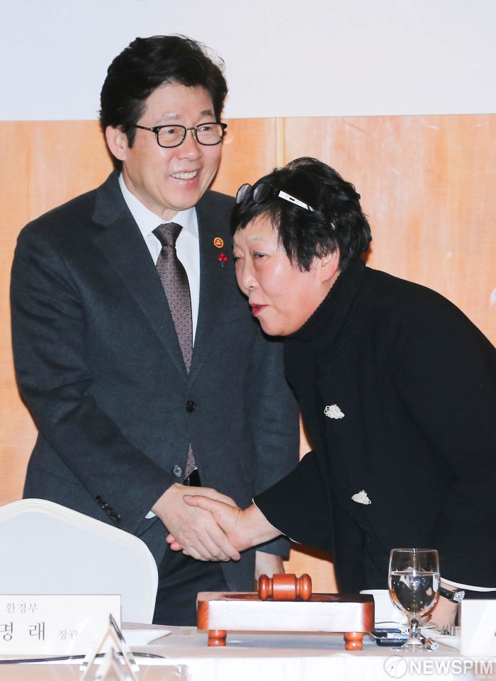 [서울=뉴스핌] 윤창빈 기자 = 조명래 환경부 장관, 이은희 한국기후⋅환경네트워크 상임대표가 20일 오후 서울 중구 롯데호텔에서 열린 제2차 한국기후⋅환경네트워크 대표자회의에서 인사를 나누고 있다. 2019.12.20 pangbin@newspim.com