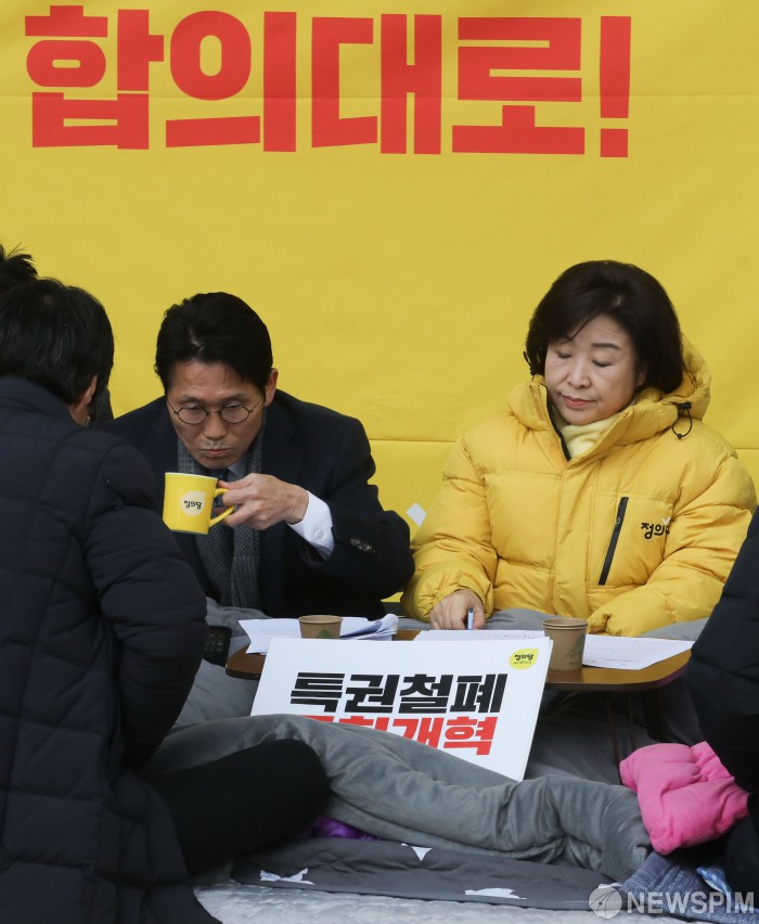 [서울=뉴스핌] 최상수 기자 = 심상정 정의당 대표, 윤소하 원내대표가 26일 오전 서울 여의도 국회 앞에서 '패스트트랙법 즉각 통과 정의당 비상행동 국회 농성'을 이어가고 있다. 2019.12.26 kilroy023@newspim.com