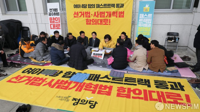 [서울=뉴스핌] 최상수 기자 = 심상정 정의당 대표, 윤소하 원내대표가 26일 오전 서울 여의도 국회 앞에서 '패스트트랙법 즉각 통과 정의당 비상행동 국회 농성'을 이어가고 있다. 2019.12.26 kilroy023@newspim.com