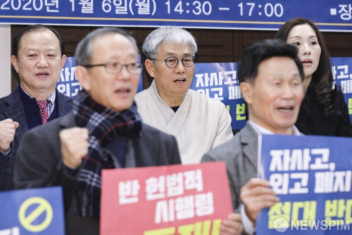 [서울=뉴스핌] 이한결 기자 = 한만위 민족사관고등학교 교장(가운데)이 6일 오후 서울 중구 한국프레스센터에서 사회정의를 바라는 전국교수모임(정교모)에 의해 열린 ‘문재인 정부의 외고, 자사고, 국제고 폐지 반대 정책토론회’에서 자사고 대표로 참석해 구호를 외치고 있다. 2020.01.06 alwaysame@newspim.com