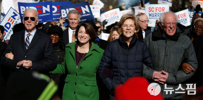 | [콜럼비아 로이터=뉴스핌] 최원진 기자= 2020년 미국 대선 민주당 경선후보인 (왼쪽부터) 조 바이든 전 부통령, 에이미 클로버샤 상원의원(미네소타), 엘리자베스 워런 상원의원(매사추세츠), 버니 샌더스 상원의원(버몬트)이 사우스캐롤라이나주 콜롬비아서 열린 '마틴 루터 킹 데이 퍼레이드' 행사에 참석했다. 마틴 루터 킹 데이는 매년 1월 세 번째 월요일에 기념하는 날로, 흑인 해방운동의 지도자인 마틴 루터 킹 주니어 목사의 업적을 기린다. 2020.01.20 wonjc6@newspim.com |
