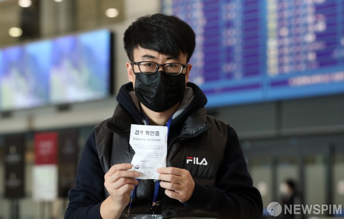 [영종도=뉴스핌] 정일구 기자 = 신종 코로나바이러스 감염증 예방을 위해 강화된 조치로 중국인 전용 입국장이 별도로 신설된 4일 오전 인천국제공항 제1터미널에서 검역을 통과한 중국인 관광객이 검역 확인증을 들어보이고 있다. 2020.02.04 mironj19@newspim.com