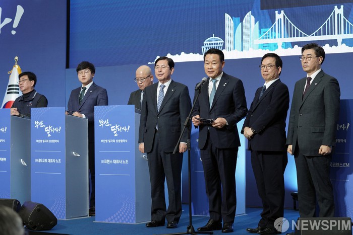 [서울=뉴스핌]=조용국 ㈜코렌스 회장 이 6일 부산시청에서 열린 '부산형 일자리 상생 협약식' 에서 소감을 말하고 있다. [사진=청와대 ] 2020.02.06.photo@newspim.com