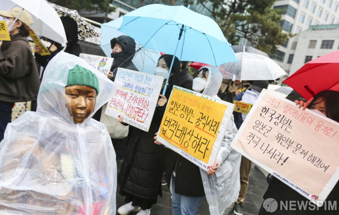 [서울=뉴스핌] 이한결 기자 = 12일 오후 서울 종로구 옛 주한 일본대사관 앞 평화로에서 열린 ‘제1426차 일본군성노예제 문제해결을 위한 정기 수요시위’에서 참가자들이 우산을 든 채 구호를 외치고 있다. 2020.02.12 alwaysame@newspim.com