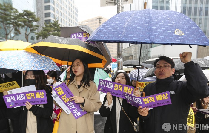[서울=뉴스핌] 이한결 기자 = 12일 오후 서울 종로구 옛 주한 일본대사관 앞 평화로에서 열린 ‘제1426차 일본군성노예제 문제해결을 위한 정기 수요시위’에서 참가자들이 우산을 든 채 구호를 외치고 있다. 2020.02.12 alwaysame@newspim.com