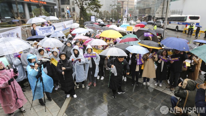[서울=뉴스핌] 이한결 기자 = 12일 오후 서울 종로구 옛 주한 일본대사관 앞 평화로에서 열린 ‘제1426차 일본군성노예제 문제해결을 위한 정기 수요시위’에서 참가자들이 우산을 든 채 구호를 외치고 있다. 2020.02.12 alwaysame@newspim.com
