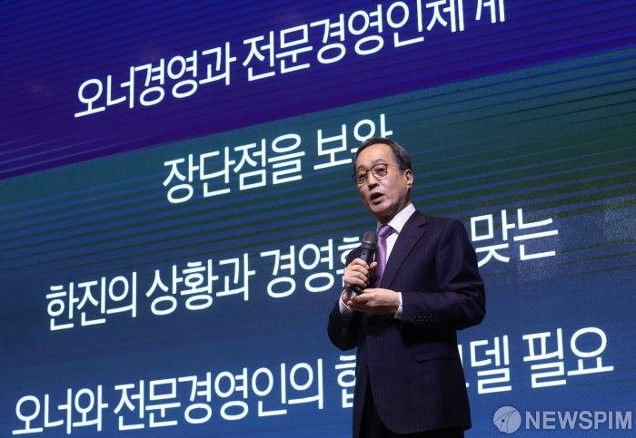 [서울=뉴스핌] 백인혁 기자 = 3자 연합이 내세운 사내이사 후보 김신배 전 SK그룹 부회장이 20일 오전 서울 영등포구 글래드 호텔에서 열린 '한진그룹 정상화를 위한 주주연합 기자간담회'에서 프리젠테이션 발표를 하고 있다. 2020.02.20 dlsgur9757@newspim.com