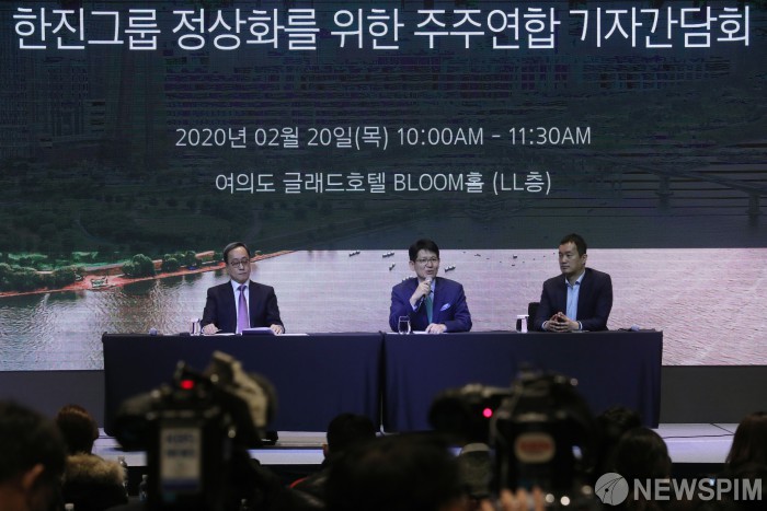 [서울=뉴스핌] 백인혁 기자 = 강성부 KCGI 대표(가운데)와 3자 연합이 내세운 사내이사 후보 김신배 전 SK그룹 부회장(왼쪽)이 20일 오전 서울 영등포구 글래드 호텔에서 열린 '한진그룹 정상화를 위한 주주연합 기자간담회'에서 취재진의 질문에 답변하고 있다. 2020.02.20 dlsgur9757@newspim.com