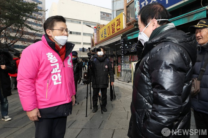 [서울=뉴스핌] 최상수 기자 = 4·15 총선에서 종로에 출마하는 황교안 미래통합당 대표가 21일 오전 종로구 낙원동 일대에서 시민들을 만나 인사를 나누고 있다. 2020.02.21 kilroy023@newspim.com