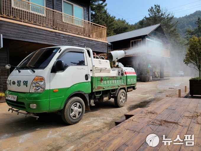많은 관광객들이 방문하는 산림문화체험관과 유아숲체험관은 지난 3일 자체 방역 차량을 이용해 특별 방역을 실시했다. 근무자 마스크 착용 의무화 및 손소독제 비치, 홍보물 부착 등으로 코로나19 예방에 힘쓰고 있다.