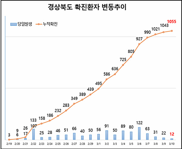 | 경북도내 코로나19 확진자 발생추이(10일 0시 기준)[자료=경북도] |
