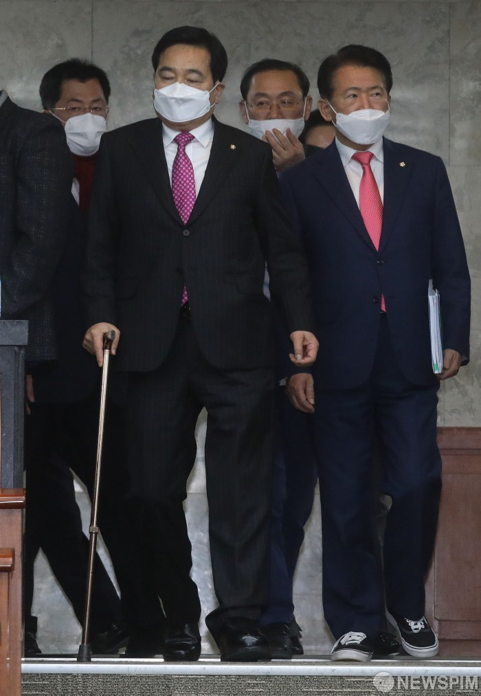 [서울=뉴스핌] 최상수 기자 = 심재철 미래통합당 원내대표(왼쪽 두번째), 김한표 원내수석부대표(오른쪽)가 17일 오후 서울 여의도 국회에서 열린 의원총회에 참석하고 있다. 2020.03.17 kilroy023@newspim.com