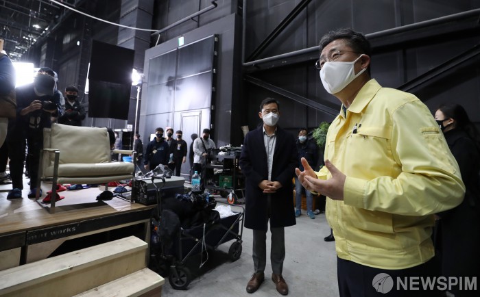[서울=뉴스핌] 이현경 기자 = 박양우 문화체육관광부 장관이 19일 코로나19 확산 방지를 위해 경기도 고양시 일산스튜디오를 찾아 드라마 촬영 중인 제작진을 격려하고 방역 실태를 점검하고 있다. [사진=문체부] 2020.03.20 89hklee@newspim.com