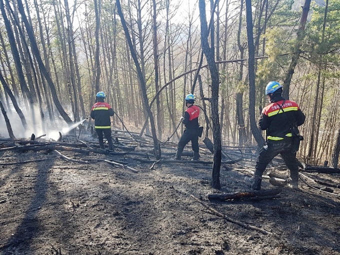 산림청 중앙산불방지대책본부(본부장 박종호)는 이날 오후 1시14분쯤 발생한 산불을 오후 5시 22분쯤 진화 완료하고 잔불 정리에 들어갔다고 밝혔다.