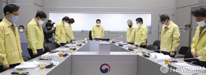 [서울=뉴스핌] 이한결 기자 = 정세균 국무총리와 장관 등 국무위원들이 서해 수호의 날인 27일 오전 서울 종로구 정부서울청사 중앙재난안전상황실 서울상황센터에서 열린 코로나바이러스감염증-19(코로나19) 대응 중앙재난안전대책본부 회의에 앞서 천안함 피격 10주기 추모 묵념을 하고 있다. 2020.03.27 alwaysame@newspim.com