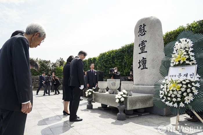 [서울=뉴스핌] 문재인 대통령과 부인 김정숙 여사가 3일 오전 제주 4·3 평화공원에서 열린 '제72주년 제주 4·3 희생자 추념식'에 참석한 뒤 4.3희생자와 군․경 신위를 한곳에 모셔 같이 위령제를 지내는 제주 애월읍 영모원을 찾아 위령단에 분향후 묵념을 하고 있다. [사진=청와대 ] 2020.04.03 photo@newspim.com